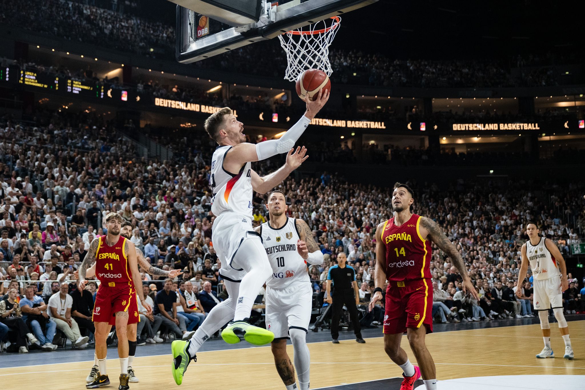 NBA-Jungstar Franz Wagner führte das Team vor stimmungsvoller Kulisse mit 29 Zählern an. In der ersten Halbzeit hatte Wagner bereits 15 Punkte bei einer perfekten Wurfquote erzielt. Auch Kapitän Schröder war beim Rückspiel gegen den Rivalen eine der prägenden Figuren. Der Spielmacher kam auf 22 Punkte und neun Assists. Zwei Tage zuvor hatte der Weltmeister – auch dank Schröder – mit 106:105 nach Verlängerung in Madrid gewonnen.